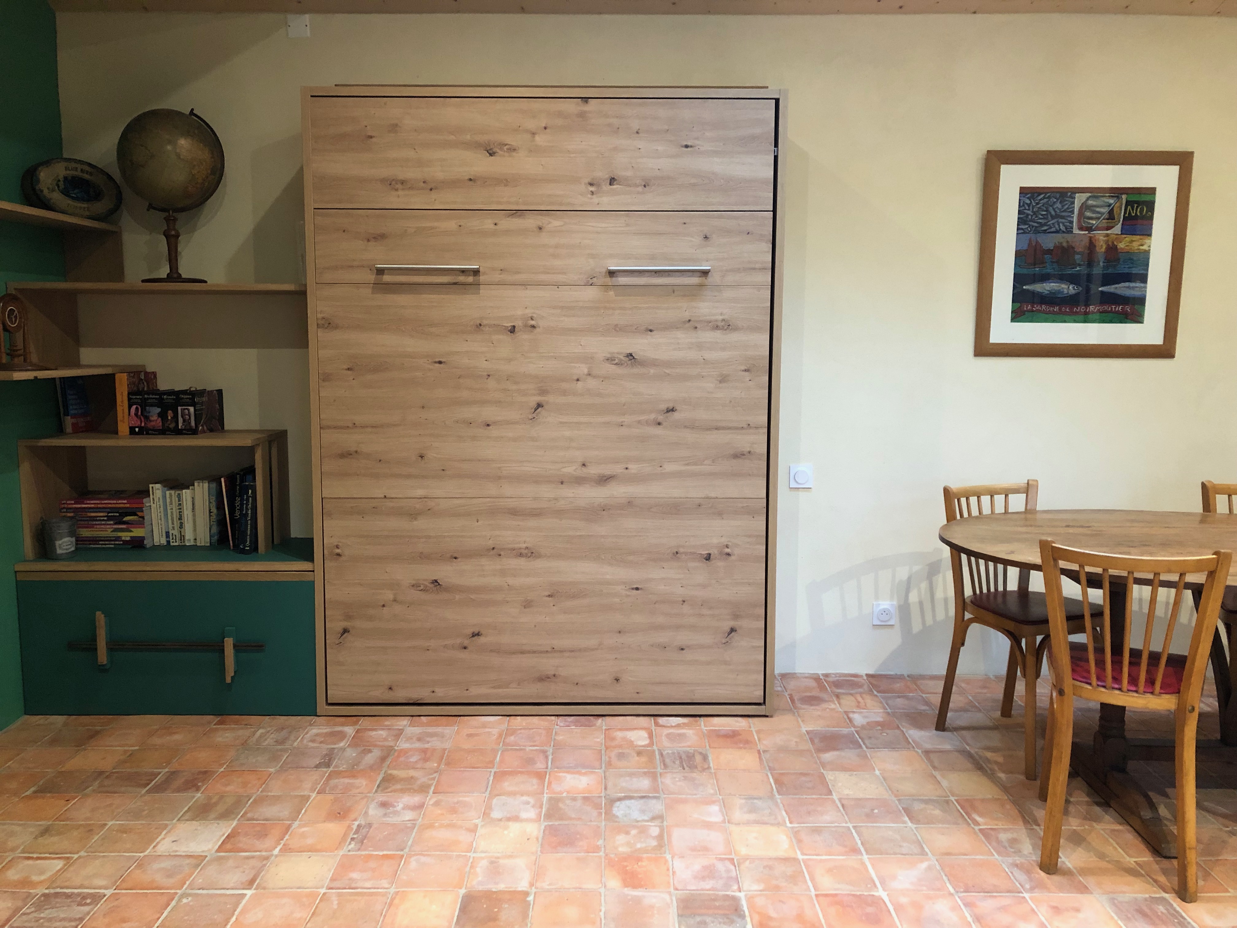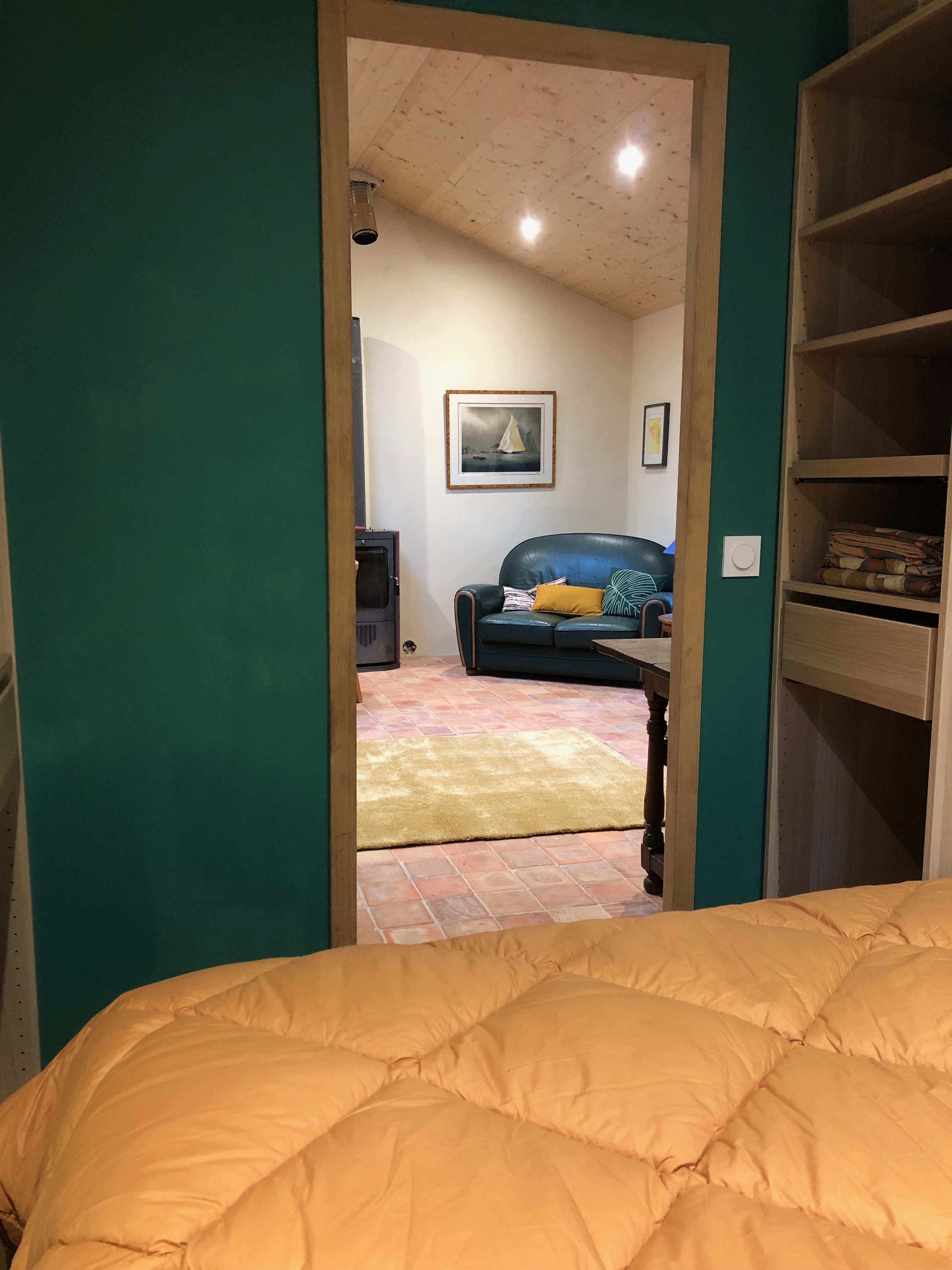– une pièce de vie de 22 m2 avec un lit escamotable de 140×190, un poêle à bois, un espace repas et un coin salon