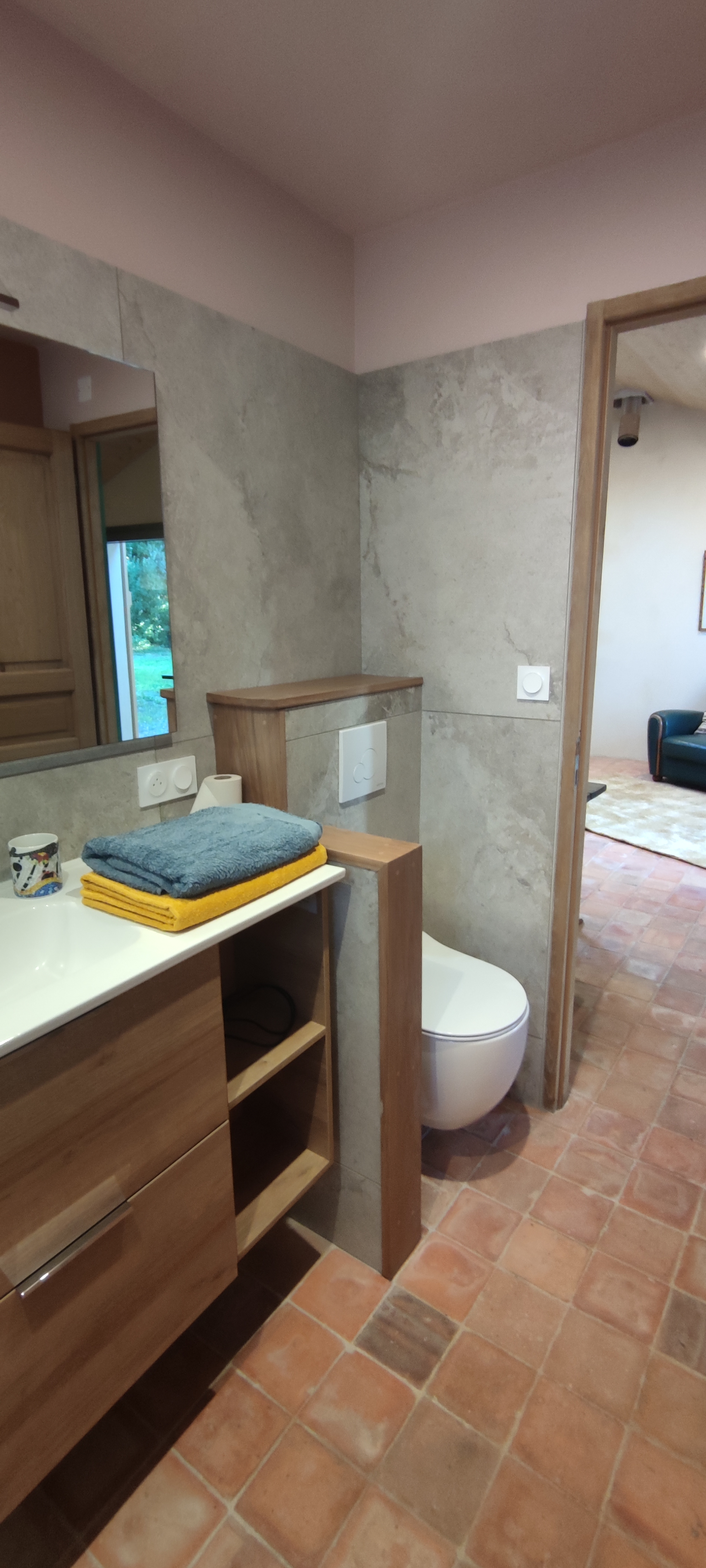 Récemment construit en matériaux bio-sourcés, notre gîte offre un mélange de charme traditionnel et de confort moderne. Ses murs sont en briques de chanvre enduits à la chaux (intérieur/extérieur) et l’ensemble est isolé en laine de bois. Les cloisons sont en bois et Fermacell (substitut écologique du Placoplatre). Le sol est en carreaux de terre cuite.